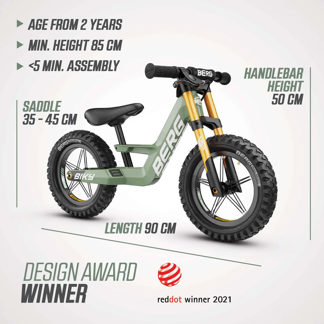 The BERG Biky Cross is an excellently designed balance bike that offers a trilling off-road ride for children from 2 to 5 years old. This award winning bike features super lightweight but exceptionally durable magnesium frame with cool aluminium double fork. By using the latest production techniques and lightweight magnesium, BERG has been able to develop an exceptionally sturdy frame with a very low weight. This makes the bike both easy to handle and great to ride.
