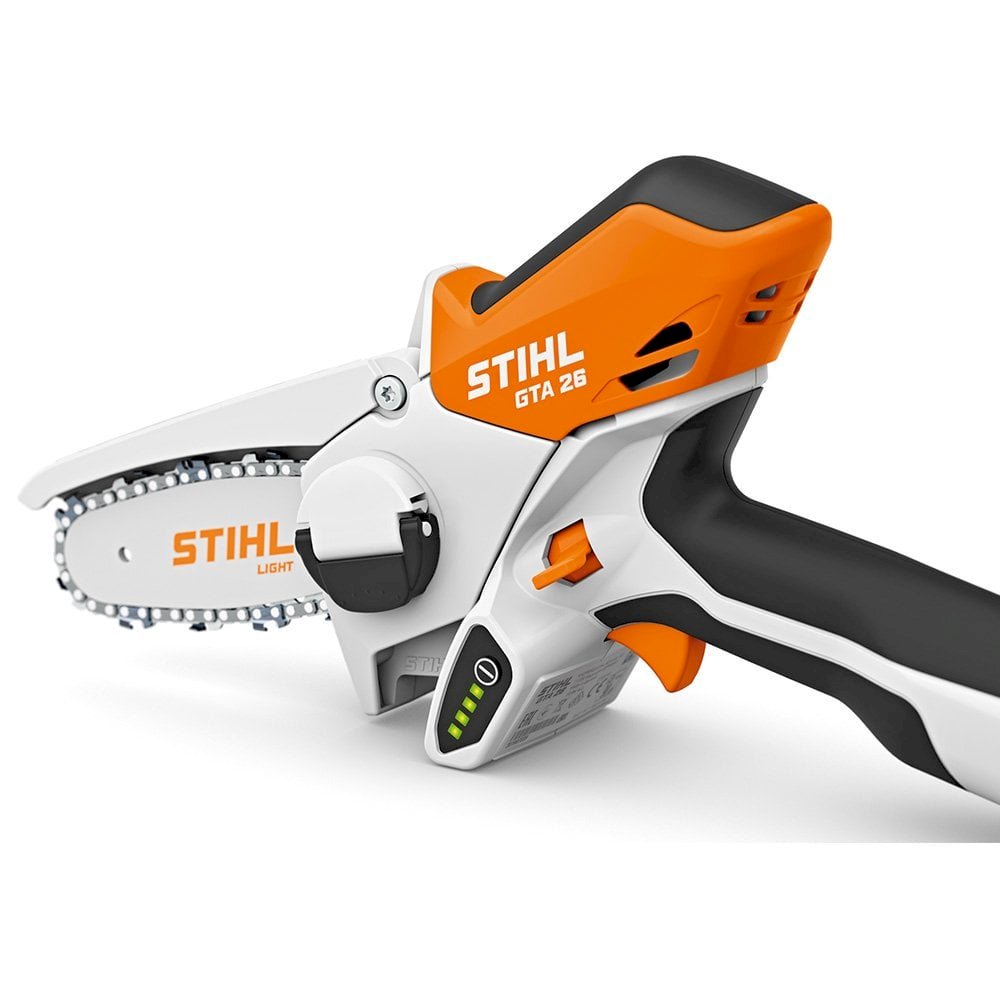 The STIHL GTA 26 is ideal for pruning trees and shrubs, cutting up garden waste, and building with wood. With a 1/4" PM3 saw chain for excellent cutting performance and powerful cuts. Comfortable, rubberised handles for easy and accurate control. Tool-free chain replacement and moving protective hood above the bar, with charge-level indicator.